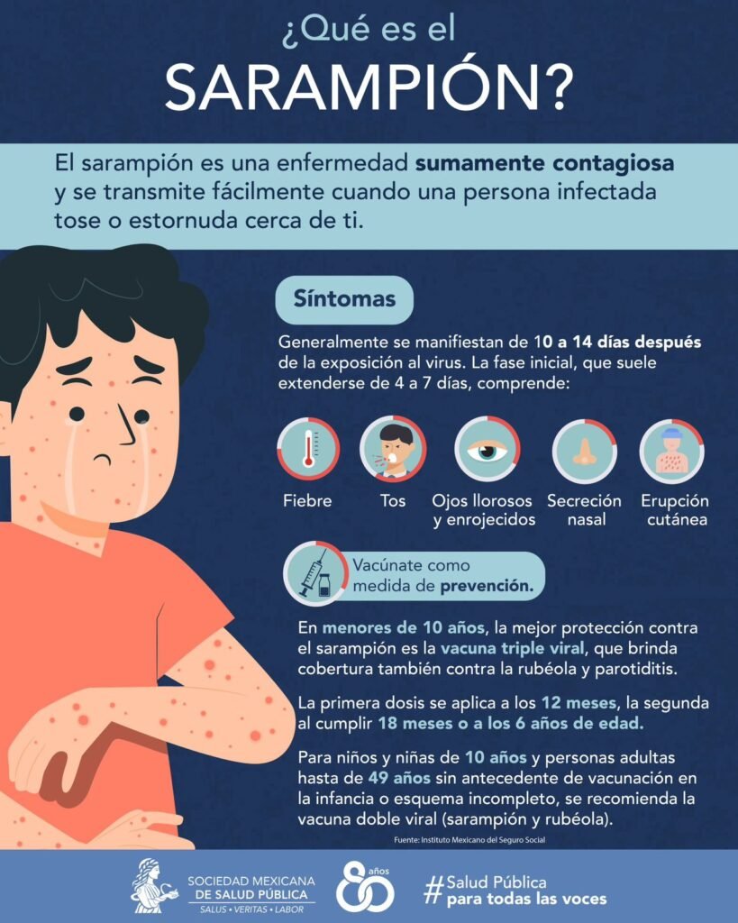 La Secretaría de Salud exhortó a los padres de familia a estar alertas ante signos como fiebre alta, tos, secreción nasal y, principalmente, el salpullido característico que inicia en la cara y se extiende al resto del cuerpo.